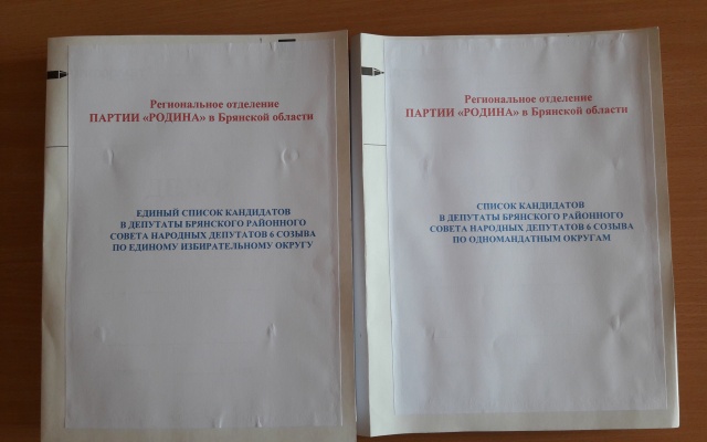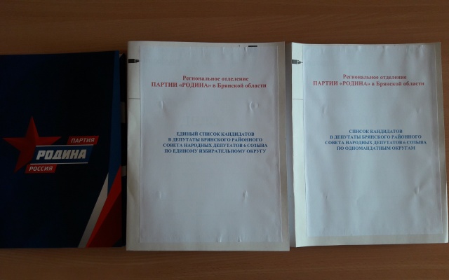 1 июля 2018 года Брянское региональное отделение партии "РОДИНА" представило в Территориальную избирательную комиссию Брянского района документы по выдвижению единого списка кандидатов и списка кандидатов в депутаты Брянского районного Совета народных депутатов по одномандатным избирательным округам.