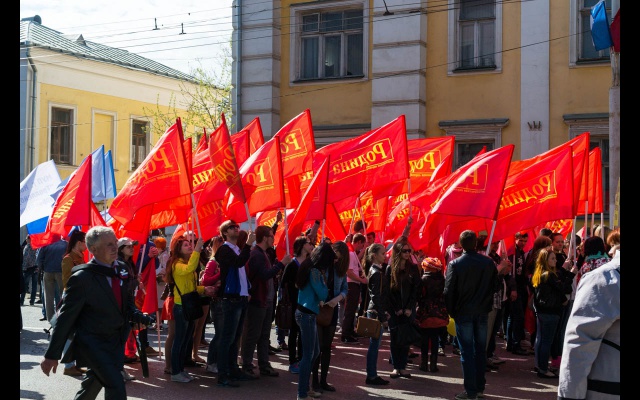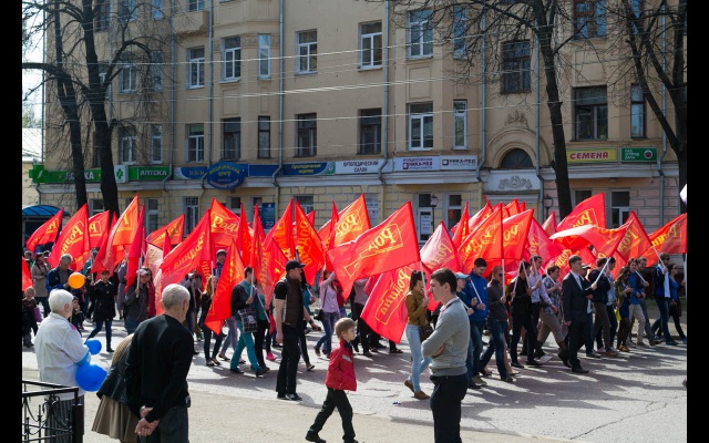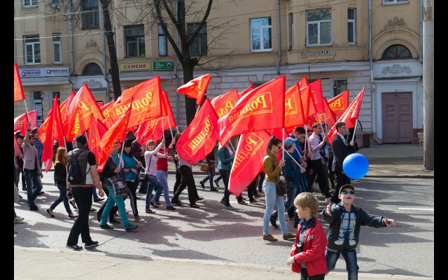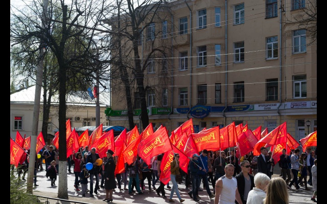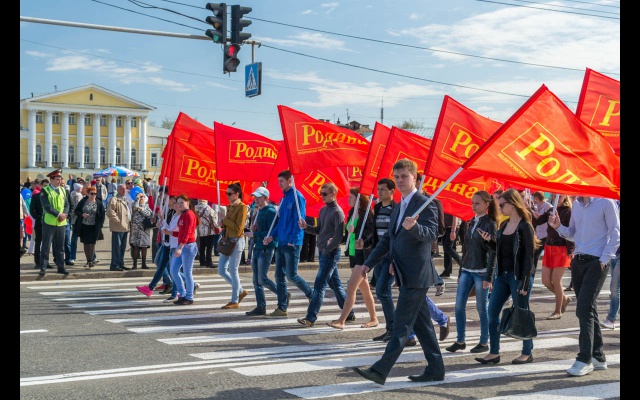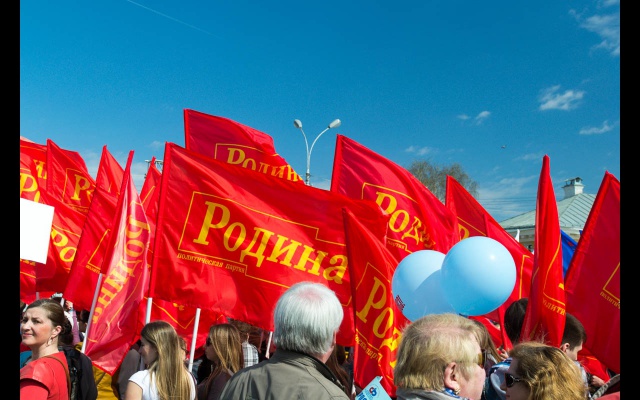 Активисты партии "РОДИНА" вышли на первомайскую демонстрацию с флагами и партийной атрибутикой.